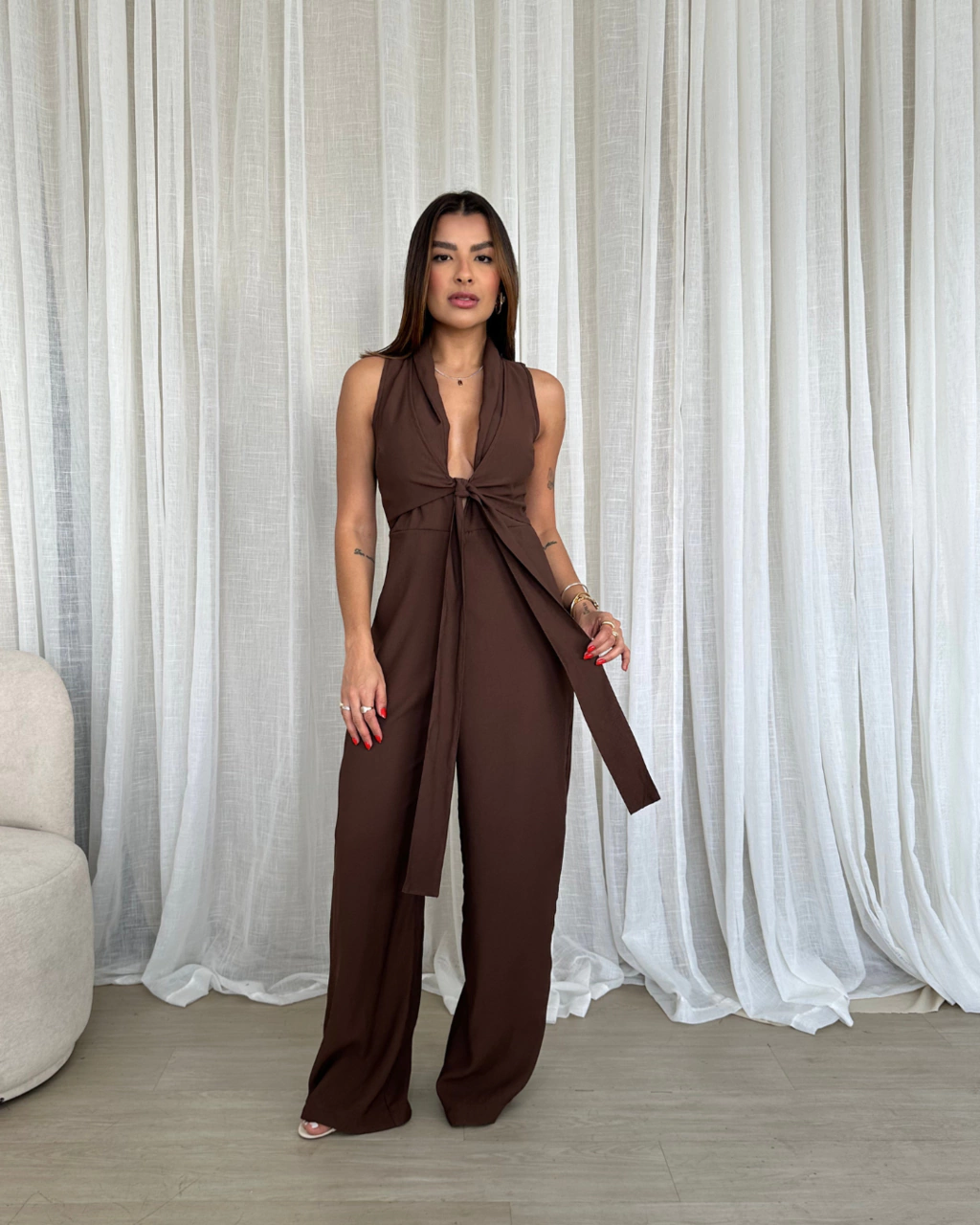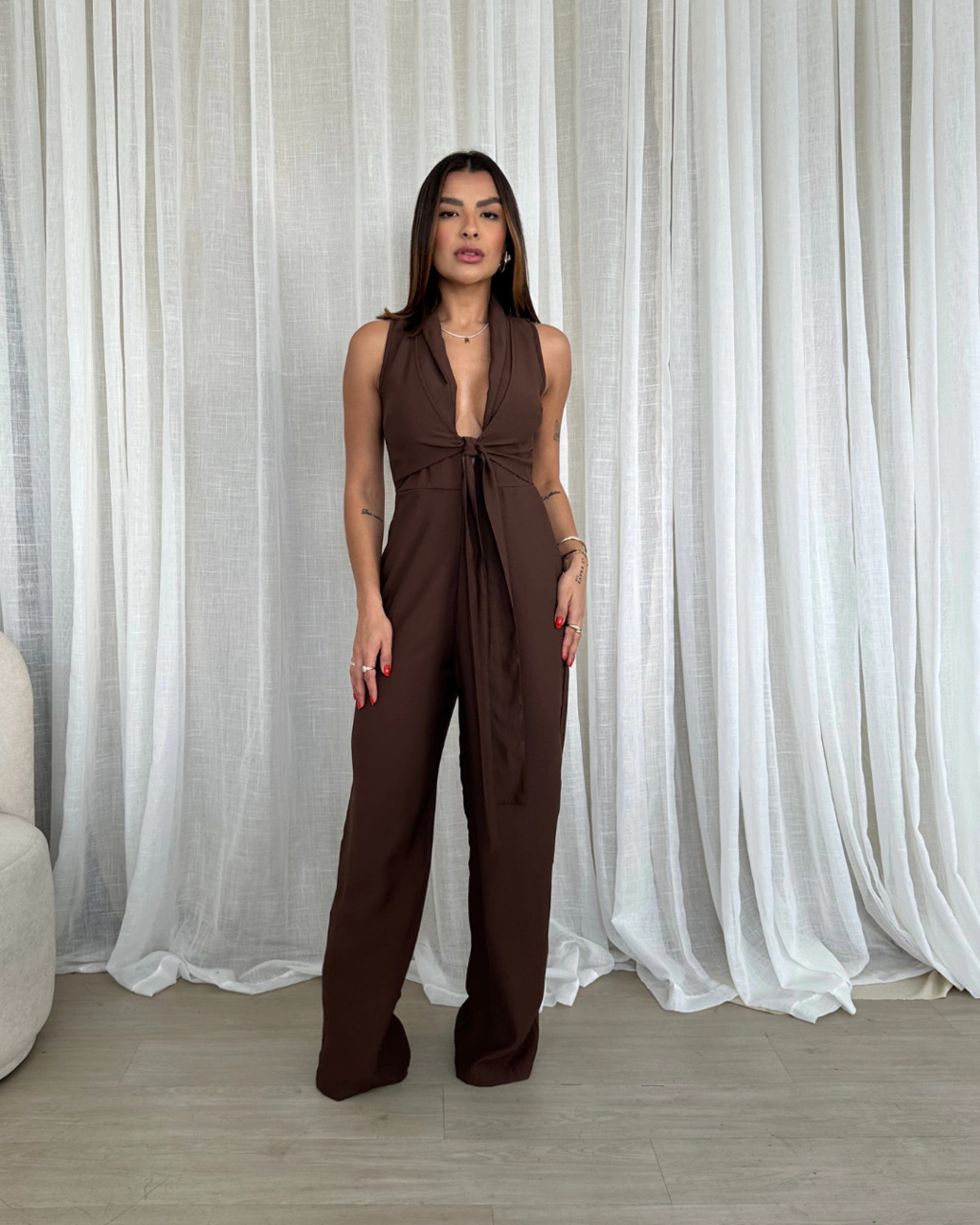Macacão Feminino Alfaiataria Moderna – Longo Sem Manga, Decote V e Faixa para Amarrar